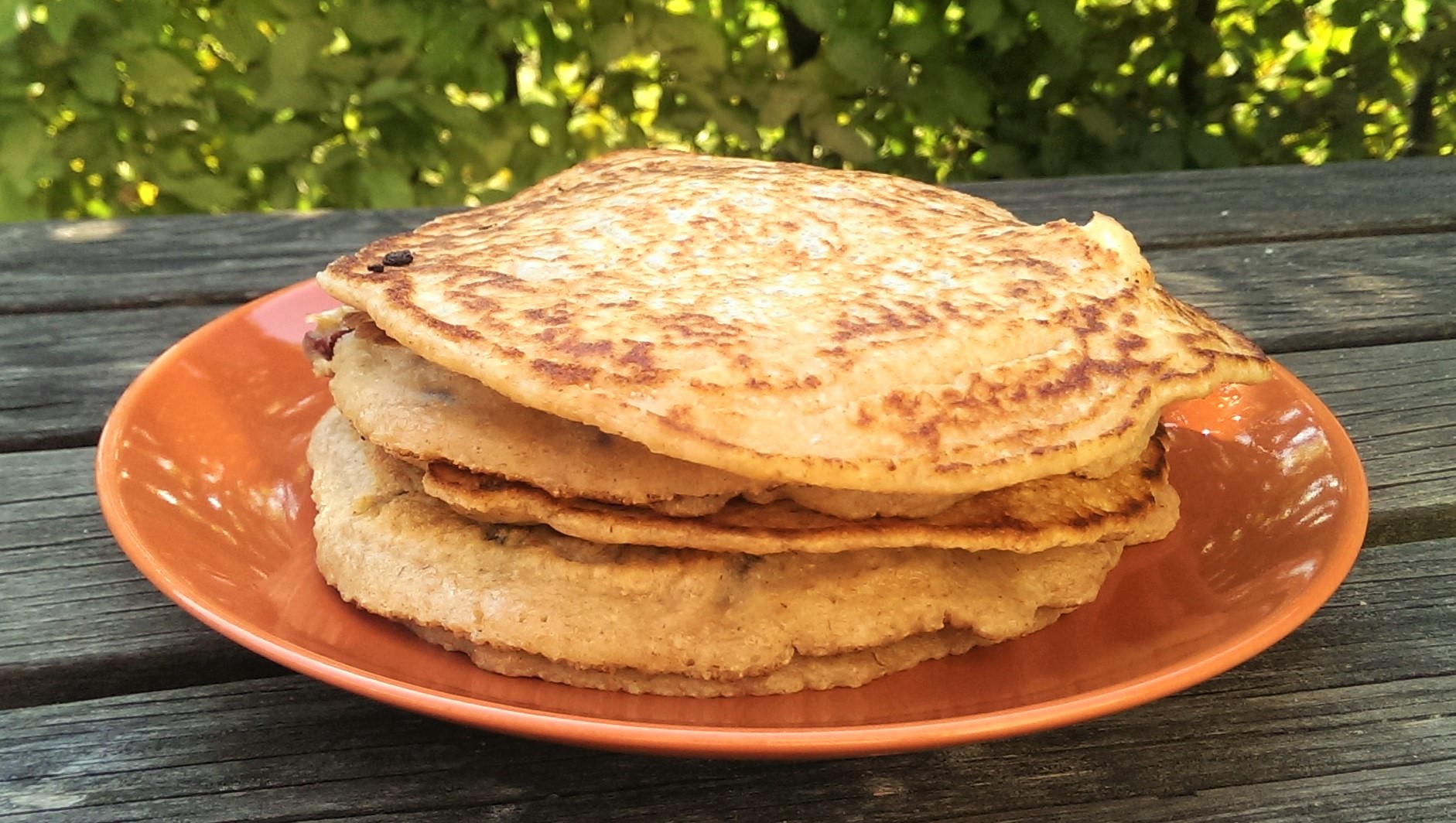Resultatet? Grove pandekager, nærmest brødagtige – og de både smager og mætter godt. Jeg spiste dem med ekstra æblestykker og honning på; det er bare at vælge yndlingsfyldet.