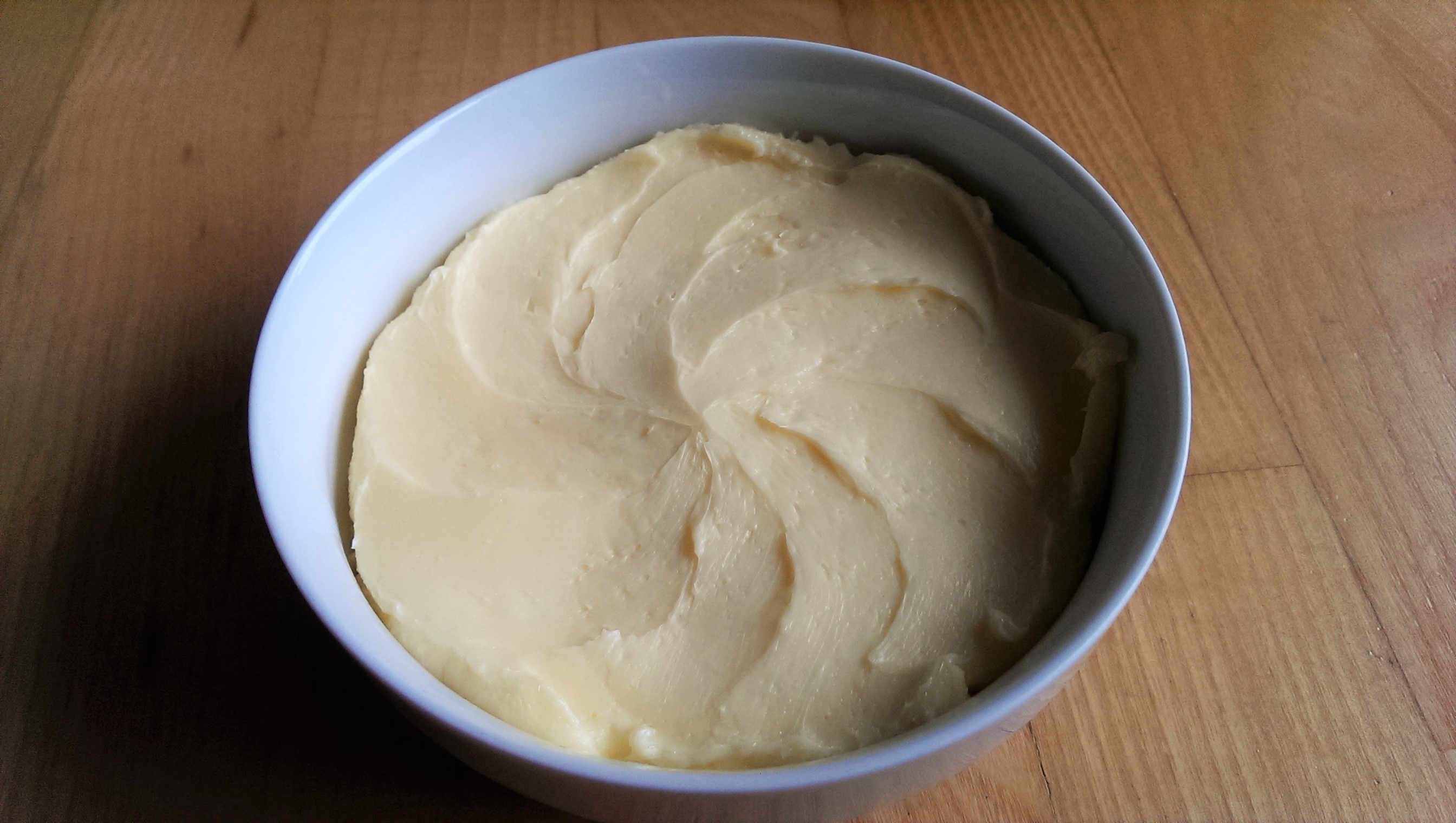 Ingredienserne blandes i en skål og samler sig i mindst et døgns tid ved stuetemperatur. Fløden skulle gerne være tyk nu. Når fløden er blevet tyk og smager som creme fraiche – men lidt mere fedtet, fordi det primært består af fløde – stilles den i køleskabet indtil brug. Det er nemmest at få smørret til at samles, når fløden er kold.