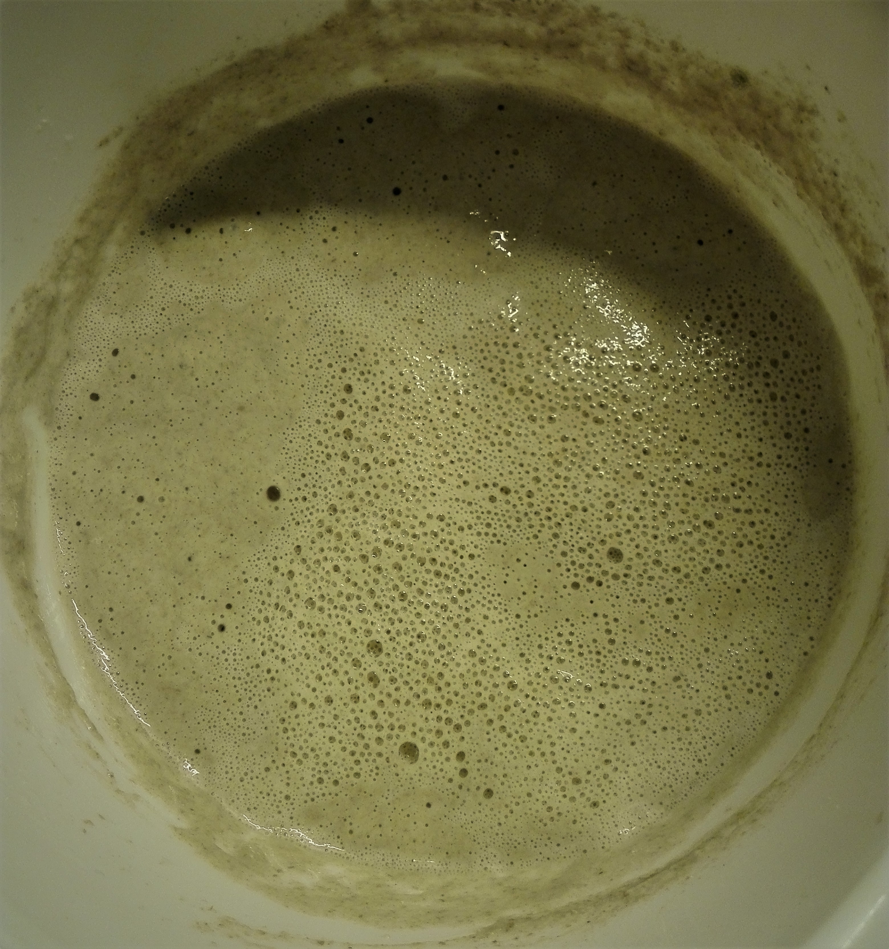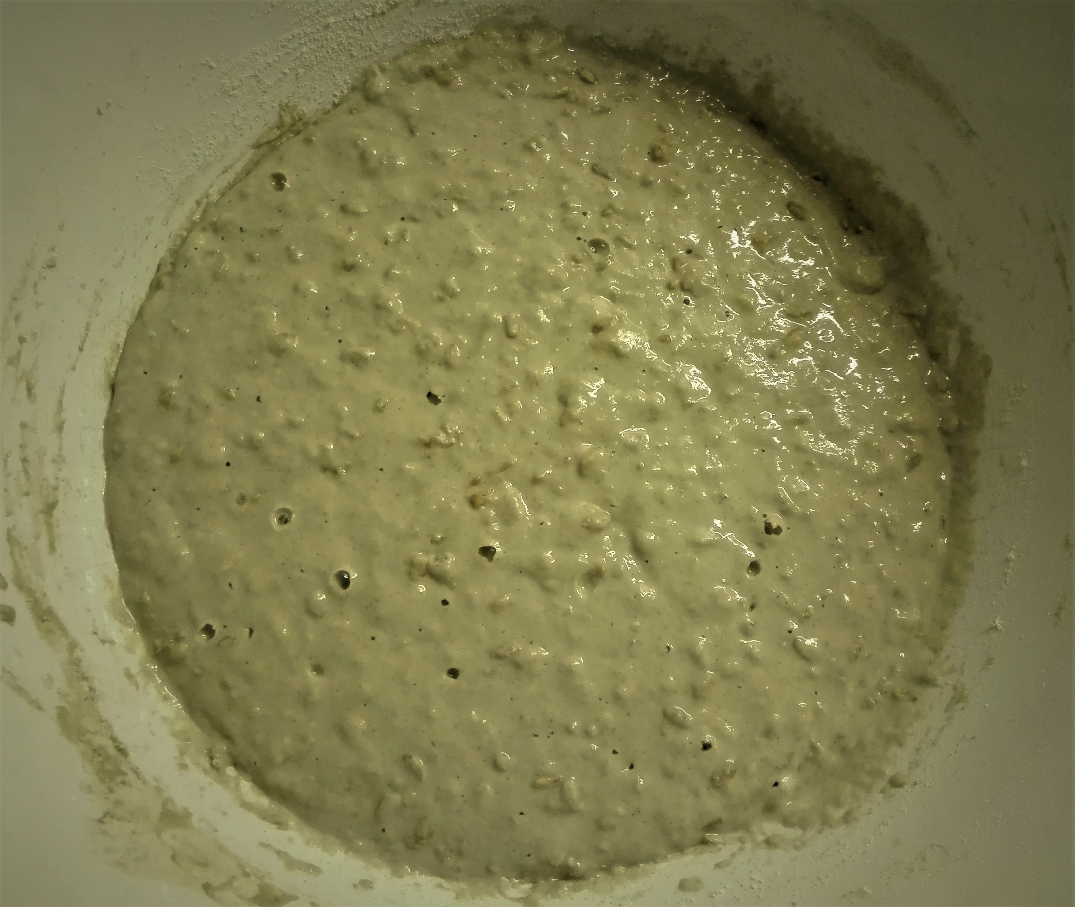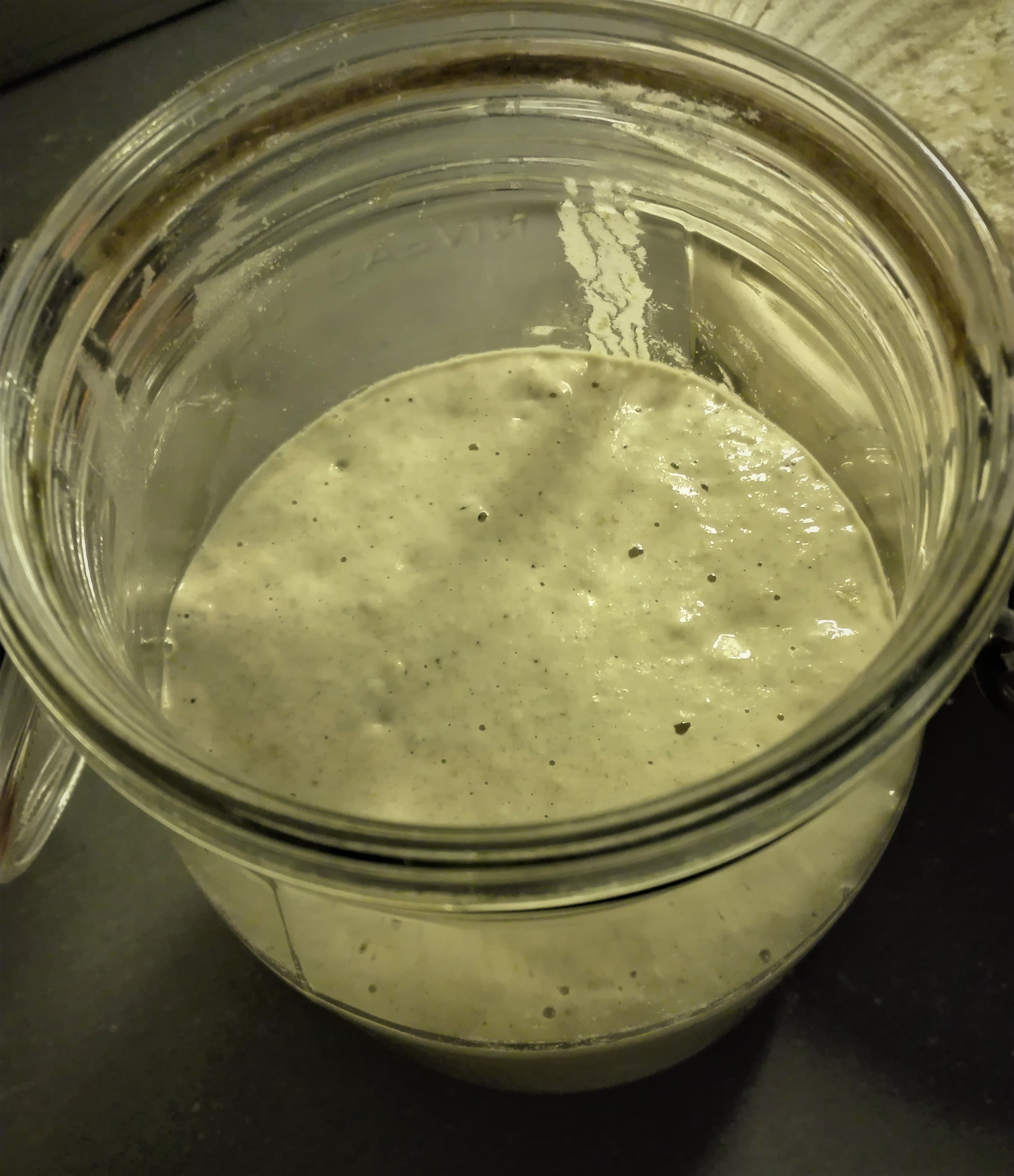 De opskrifter, jeg anvendte som inspiration til Finn, beskrev alle at man, hver gang man fodrede sin surdej, skulle smide halvdelen ud først og så give den mel og lunkent vand bagefter. Det gjorde jeg de første par dage og Finn blev hurtigt sulten når han havde spist. Der begyndte at stå et lille lag af væske ovenpå surdejen efter et halvt døgns tid. Det skulle ikke gøre noget, men jeg syntes ikke om den udvikling når jeg lige er ved at starte en surdej. Derfor blev pasningsmetoden ændret og fra dag 2-4 gjorde jeg altså følgende: jeg holdt op med at smide halvdelen af surdejen ud hver gang og jeg fodrede Finn 2 gange i døgnet i stedet for. Resultatet var som jeg håbede – der stod ikke væske ovenpå, når det var fodringstid. Finn boblede løs og hævede og opførte sig altså helt normalt igen. Surdejen begyndte endda at skumme mere og mere og det var et rigtig godt tegn.