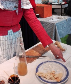 Jeg gik fra Frilandsmuseets stand med en god fornemmelse, som blot blev bedre, da jeg så Vestsjællands Museums stand. Faktisk blev jeg helt glad! For her stod der korn, kiks, grød, kærnemælk og mere fremme på et bord, tilsyneladende klar til at blive smagt på. I den tilhørende montre blev nogle arkæologiske fund præsenteret og disse var baggrund for smagsprøverne. Fund af forskellige brændte kornsorter giver anledning til nye studier udi bondestenalderens madvaner. Grøden til smagsprøverne bestod dog blot af byg og hvede, samt lidt ramsløg og kiksene lod til at være i familie med de klassiske jernalderkiks. Det sjove er dog, at der er meget få fund af ‘bageplader’ fra jernalderen. De forekommer i større antal fra bondestenalderen og jeg fik at vide, at der skal foretages analyser af nogle af disse lerbageplader for at undersøge, om de nu rent faktisk har været anvendt til kiksebagning. Spændende!