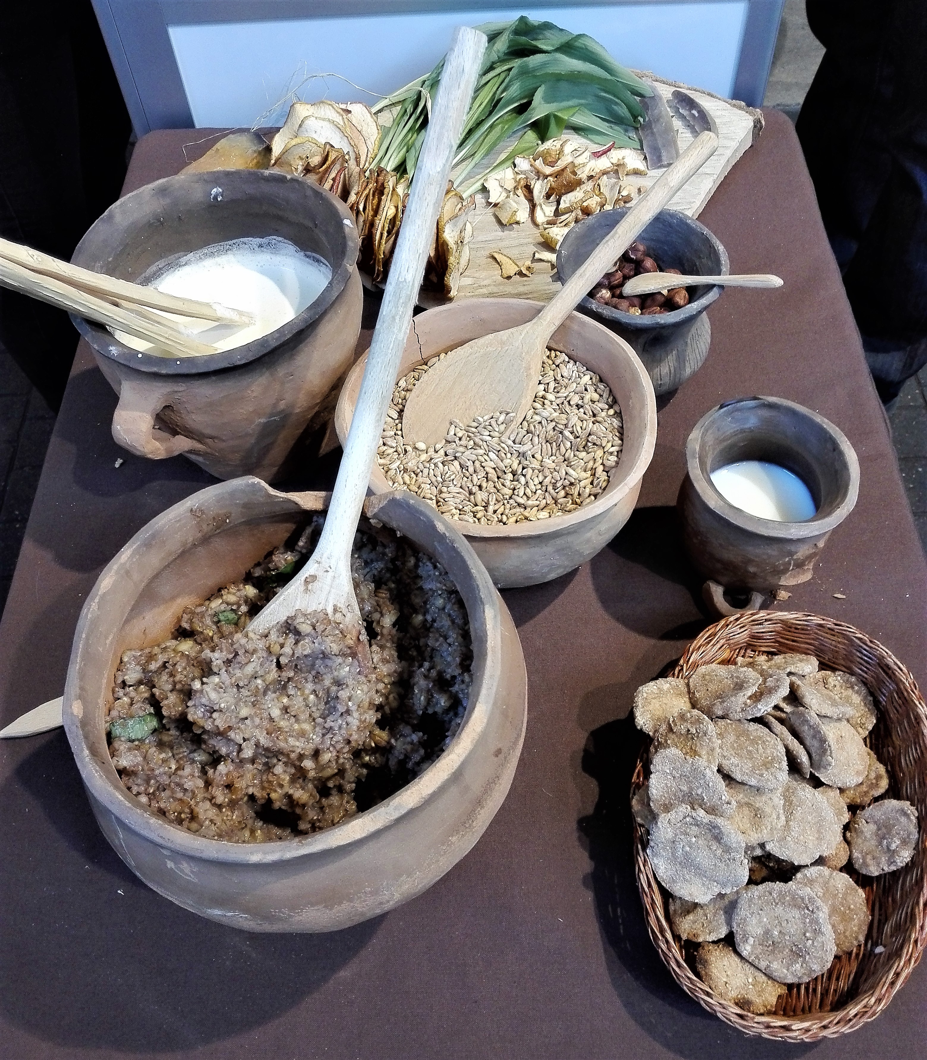 Jeg gik fra Frilandsmuseets stand med en god fornemmelse, som blot blev bedre, da jeg så Vestsjællands Museums stand. Faktisk blev jeg helt glad! For her stod der korn, kiks, grød, kærnemælk og mere fremme på et bord, tilsyneladende klar til at blive smagt på. I den tilhørende montre blev nogle arkæologiske fund præsenteret og disse var baggrund for smagsprøverne. Fund af forskellige brændte kornsorter giver anledning til nye studier udi bondestenalderens madvaner. Grøden til smagsprøverne bestod dog blot af byg og hvede, samt lidt ramsløg og kiksene lod til at være i familie med de klassiske jernalderkiks. Det sjove er dog, at der er meget få fund af ‘bageplader’ fra jernalderen. De forekommer i større antal fra bondestenalderen og jeg fik at vide, at der skal foretages analyser af nogle af disse lerbageplader for at undersøge, om de nu rent faktisk har været anvendt til kiksebagning. Spændende!