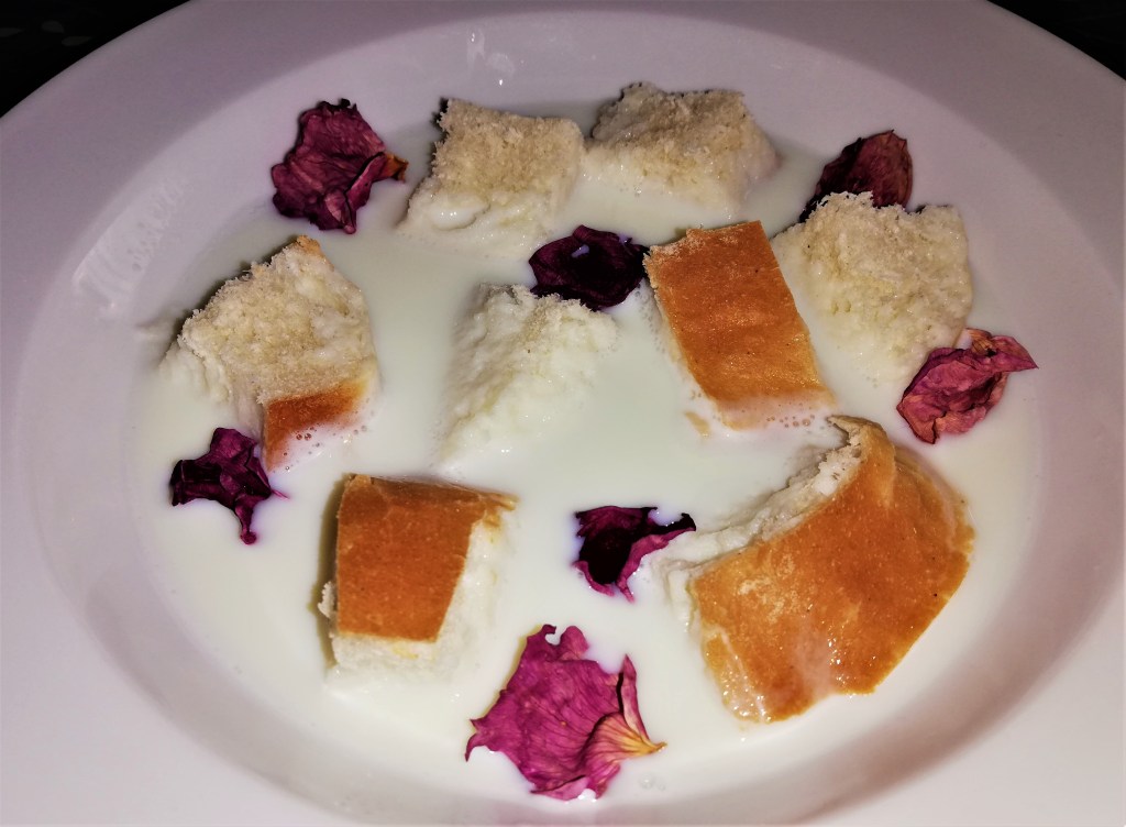Jeg har afprøvet en opskrift fra kogebogen, for lige at teste, hvordan den er at bruge i praksis. Man må bruge sin fornemmelse og smage til undervejs, for der er ofte ingen mængdeangivelser. Jeg valgte, som det første, at give mig i kast med opskriften på varm mælk. Frisk mælk har været meget fornemt blot at drikke eller spise i gamle dage, da mælken jo ikke kunne holde sig og derfor oftest blev til ost, smør og tykmælk. Opskriften er i al sin enkelhed, at man luner noget mælk – nok helst sødmælk – og smager det til med rosenvand og sukker. Den varme mælk hældes så over lidt småt skåret brød. Der er som sagt ingen mængdeangivelser, så man må selv gætte, hvor meget rosenvand der skal til. Jeg fandt dog en opskrift på mandelmælk med rosenvand andetsteds, med mængdegivelser, og tænkte, at det måske var lidt af det samme med denne opskrift. Til en halv liter sødmælk kom jeg derfor 1½ spsk. rosenvand og 4 tsk. sukker. Mælken blev hældt over nogle småt skårede hvedeboller, da jeg tænkte, at det jo var det fineste af det fine dengang.