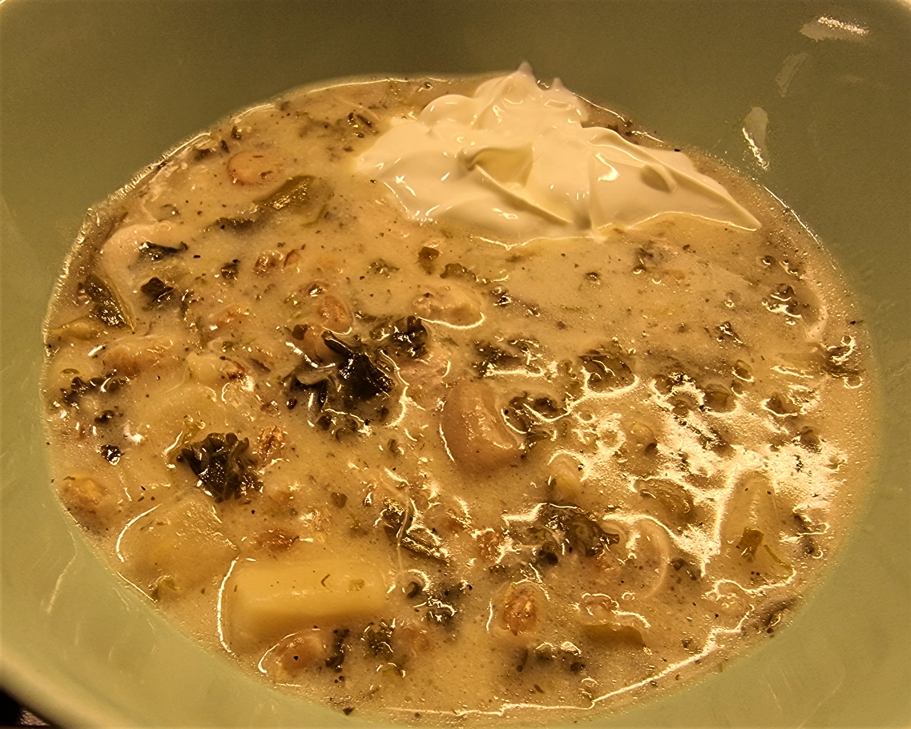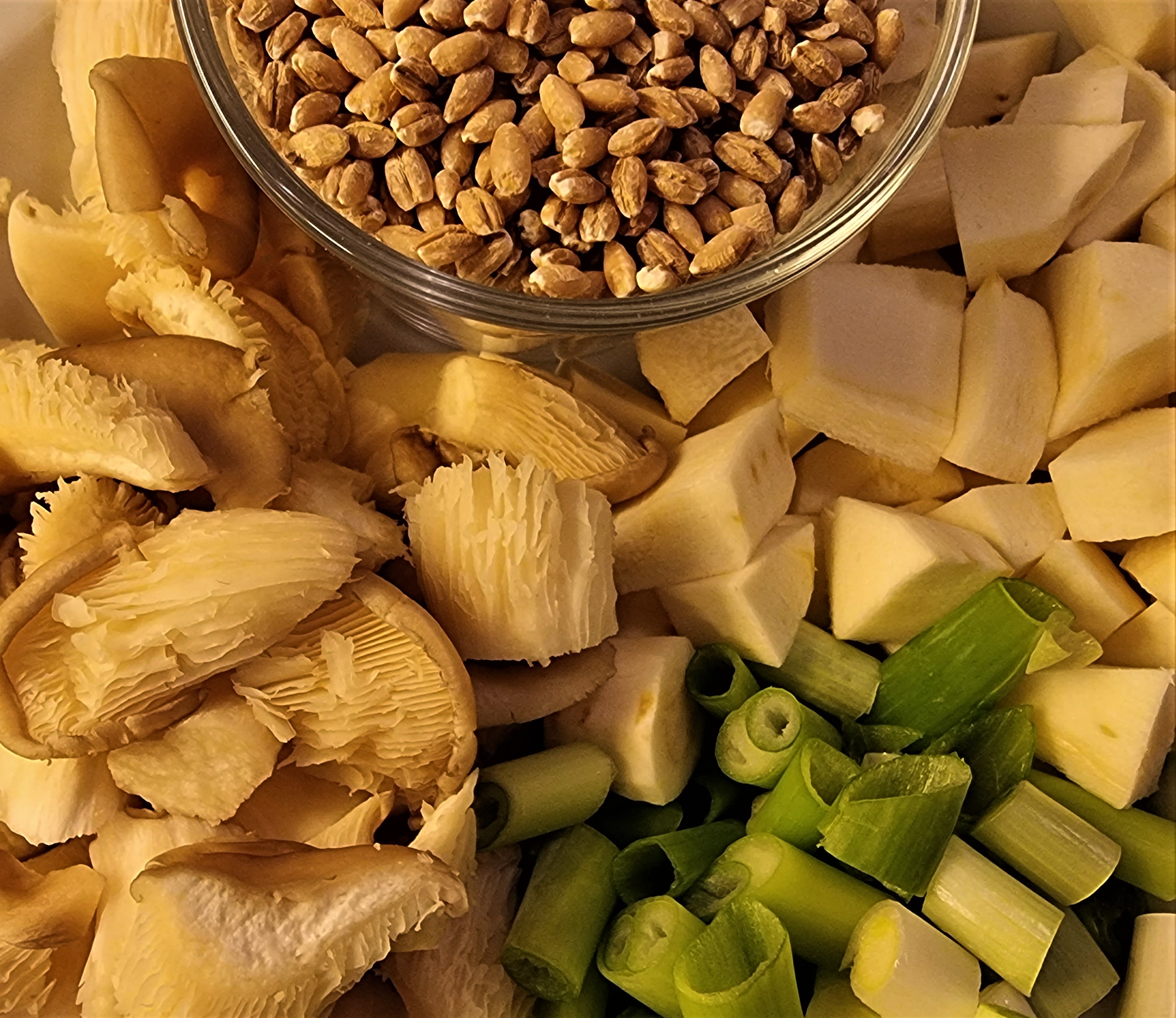 Denne gang bestod min jernaldergryde altså lidt af noget jeg havde indkøbt til formålet og noget, jeg havde i køleskabet. De indkøbte råvarar var et par overlår fra en kylling, forårsløg og østershatte. Det, jeg havde i køleskabet var en halvgammel pastinak, en rest grønkål og en rest fløde. Dertil lidt perlebyg og tørret brændenælde og ramsløg, som jeg altid har på lager. Kyllingestykkerne blev først brunet i smør i gryden, hvorefter jeg tilsatte pastinak, forårsløg og østershatte. Da det var faldet lidt sammen, tilsatte jeg grønkål, krydderier, salt og vand, så det dækkede kyllingen. Herligheden fik lov at koge i 20 minutter, før jeg tilsatte perlebyg og fløde og lod det koge i yderligere en halv time. Nu kunne kyllingestykkerne samles op og pilles fri for kød, som kom tilbage i retten. Jeg smagte til med lidt mere salt og valgte at jævne retten, da den var meget suppeagtig. Sådan er det ofte, når jeg laver sådanne retter. Når jeg vil lave suppe, bliver den altid tyk og mere det jeg kalder stuvning. Og når jeg vil lave stuvning, så får jeg suppe.