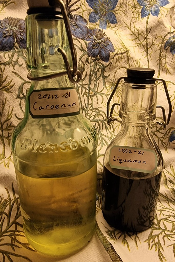 Forberedelserne til middagen begyndte dog allerede dagen før, for i opskriften stod der nogle af de særlige smagsgivere, romerne var glade for. Ligeså almindeligt som det er i dag, at komme salt og måske peber i mange retter, ligeså almindeligt var det for romerne at krydre deres mad enten med garum eller liquamen. Begge kan bedst sammenlignes med asiatisk fiskesauce – dvs. en tynd sauce lavet på gæret fisk og salt. Det har en stærk lugt, men giver maden en fantastisk smag. I opskriften skulle bruges liquamen, som man kan lave med asiatisk fiskesauce. Der skulle bare lige bruges en ingrediens mere – caroenum, som er en slags indkogt vindruesaft eller indkogt vin. Jeg brugte en hvidvin, som jeg kogte ind til det halve. Caroenum blandes med fiskesauce, cirka i forholdet 1:3 og man har nu liquamen. Stadig med en stærk lugt og smag, hvis man tager det for sig selv. Men jeg er sikker på, at det bliver godt i maden.