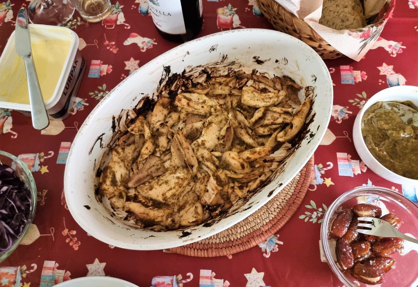 Opskriften på kyllingen og saucen dertil fandt jeg i Latinsk Kogebog, som har mange gode og interessante opskrifter og informationer. Det er også herfra desserten stammer. Vi har til solhverv tit og ofte fået noget med svinekød eller røget flæsk, da flæsk jo en en god gammel julespise og har sandsynligvis været det siden stenalderen. Men det skulle jo være så sundt at prøve noget nyt. Den romerske stegte kylling tilberedes på en lidt anden måde, end jeg er vant til. Og så er der jo marinaden, som gør hele forskellen. Til maden bagte jeg et lækkert, langtidshævet grydebrød og til maden fik vi også dulcia domestica. På ægte romersk vis serverede jeg det hele på bordet samtidig, da man dengang ikke skelnede mellem hovedret og dessert.
