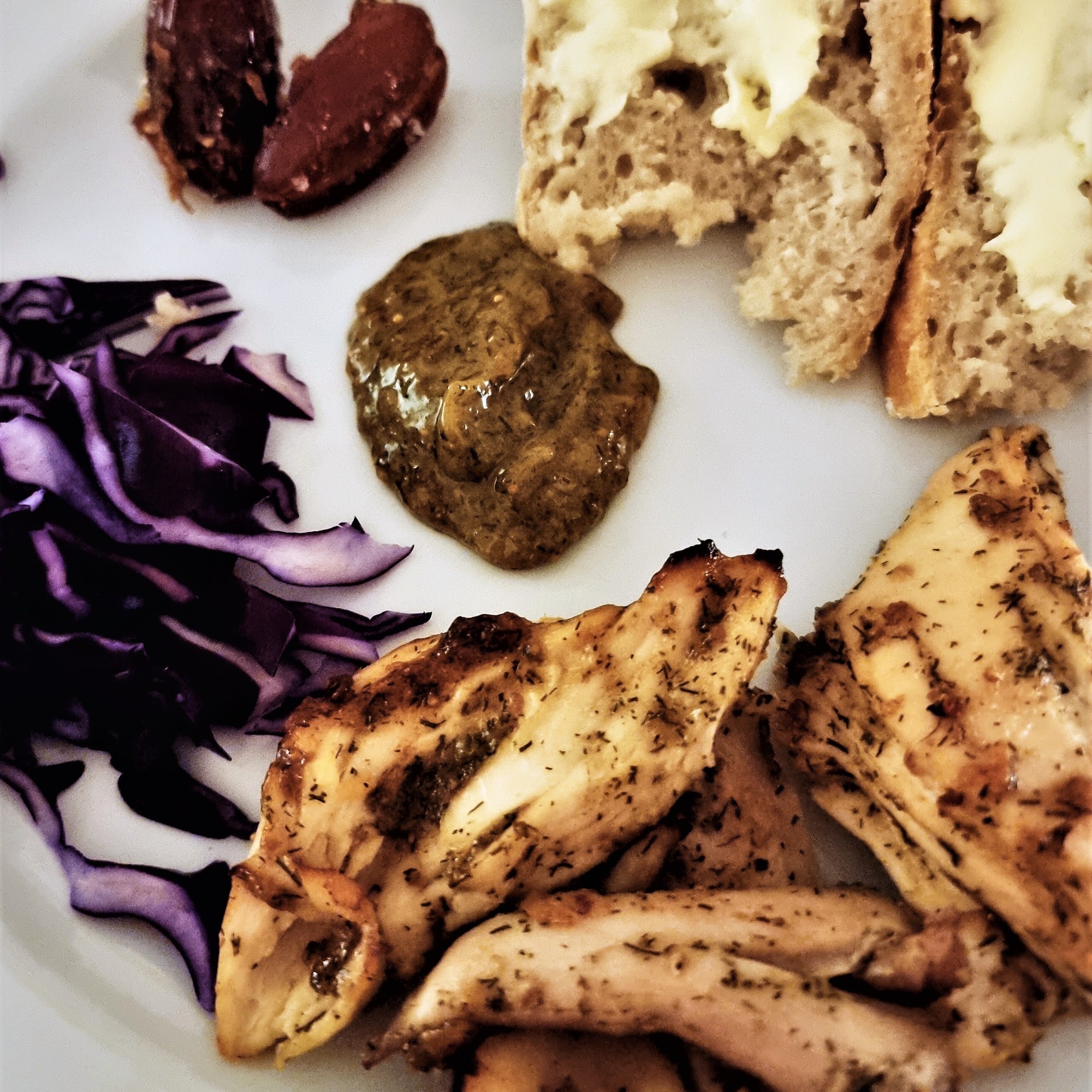 Endelig kunne maden serveres. Kyllingen blev serveret med det nybagte grydebrød med smør, dulcia domestica med mandler og peber, lidt friskskåret rødkål og resten af dildsaucen som dyppelse. Egentlig havde jeg tiltænkt at kyllingen også kunne spises med den kolde sauce og det smagte fremragende – men saucen smagte også godt sammen med rødkålen og som dyppelse til brødet. Det kunne være interessant at lave saucen som marinade til en grillstegt kylling engang.