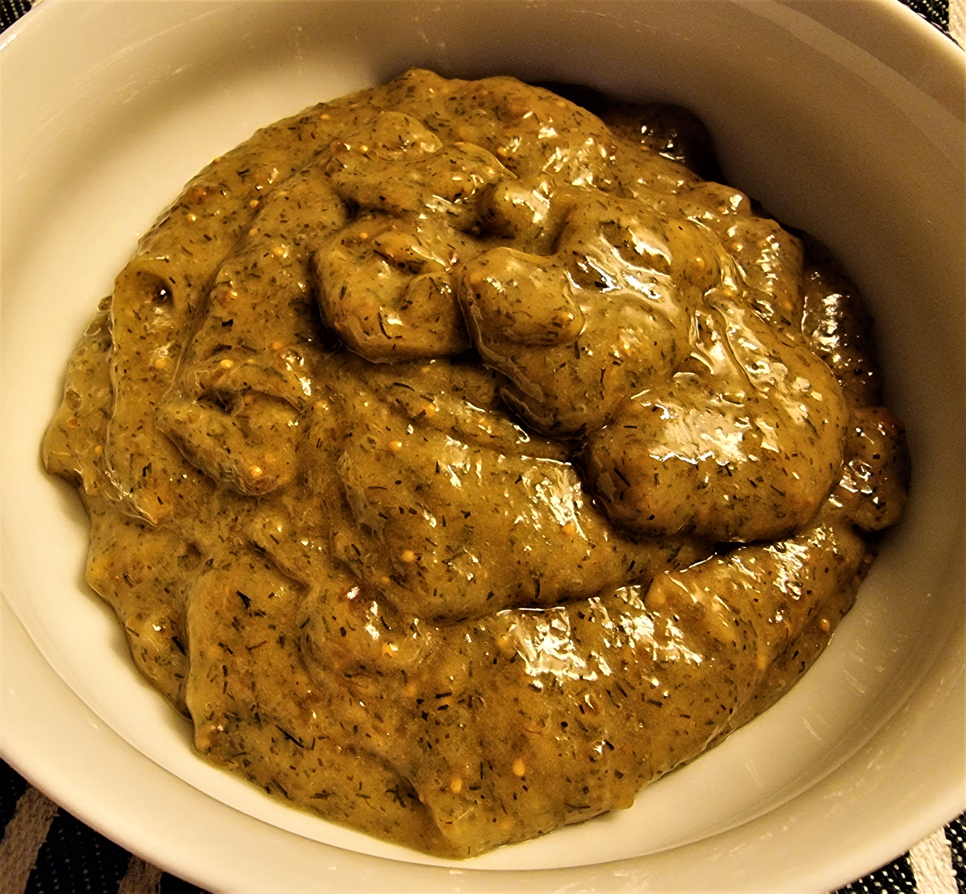 I dag forbinder man nok mest dilddressing med gravad laks. Men i det gamle Rom var det en selvstændig sauce, som kunne bruges til mange forskellige ting. I retten fra Latinsk Kogebog er den anvendt som marinade til kyllingen. Jeg fulgte opskriften på saucen så godt jeg kunne, der manglede kun et par ingredienser, men jeg fandt brugbare erstatninger. I den romerske dildsauce skal der, udover dild, også liquamen, mynte, sennep, honning, dadler og olivenolie i. Som man kan se på billedet, ligner dildsaucen ret meget vores moderne dilddressing – rævesovsen – som man ofte serverer til gravad laks. Den smagte også derhenad.