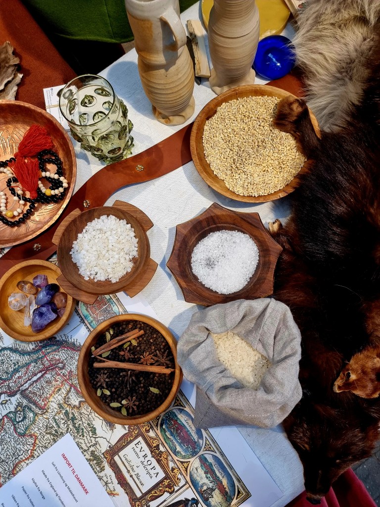 Vel indenfor på messen gik jeg på udforskning. Der var ikke helt så mange bog-stande, som jeg husker fra sidst, hvilket ikke gør mig noget. Jeg tager ikke på en sådan messe, for at købe en bog. Jeg vil hellere opleve god formidling om museer og andre historiske oplevelser. Det jeg især kom for, måtte jeg dog lede lidt efter. Jeg vidste dog heldigvis, at Middelaldercentret havde et show om middelaldermad på programmet, så jeg fandt deres stand og der var da også lidt madformidling og kendte ansigter. Jeg så frem til showet senere på dagen. Videre gik det og jeg var egentlig på vej for at se et show fra de romerske reenactors, da jeg mødte Non Nomen, hvor jeg egentlig bare lurede lidt på standen, fordi der stod en smørkærne og skåle med krydderier og salt. Pludselig var jeg i en længere samtale om middelaldermad, konservering, salt og andet spændende.