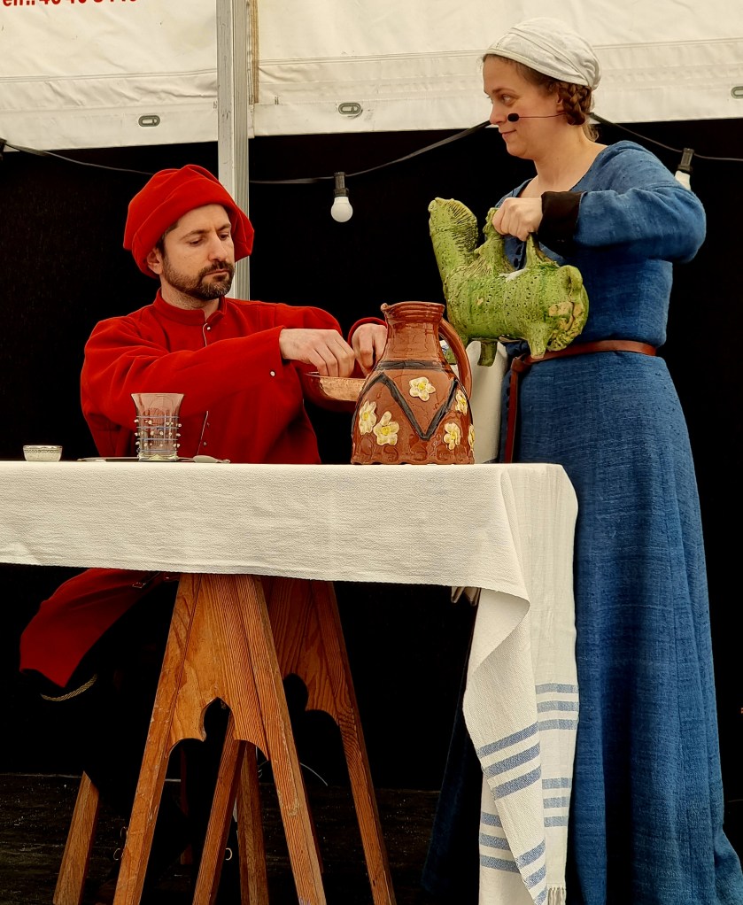 Endelig var det tid til Middelaldermad-showet. Showet handlede om, at én med penge, en jævn person og den fattige skulle alle have noget at spise. Men hvad spiste de? De to herrer sad ved bordet, mens stakkels Fattig-Marianne fik lov at sidde på kanten af scenen og vente. Det blev formidlet ganske fint, hvordan forskellen var på den mad de fik serveret og hvordan den fattige fik resterne tilsidst. Og det var ikke kedeligt, da de deltagende faktisk spillede deres roller rigtig godt. Det var underholdende og publikum grinede flere gange – der var god stemning i teltet.