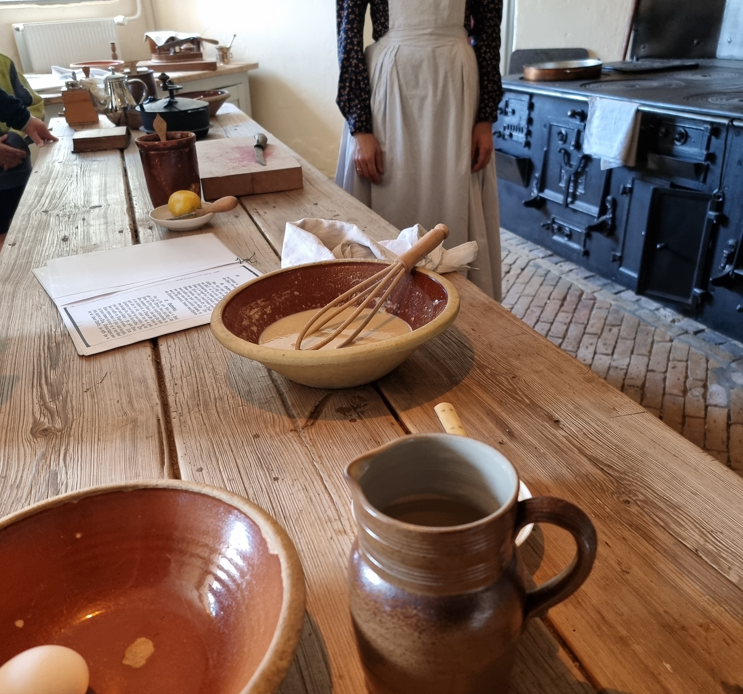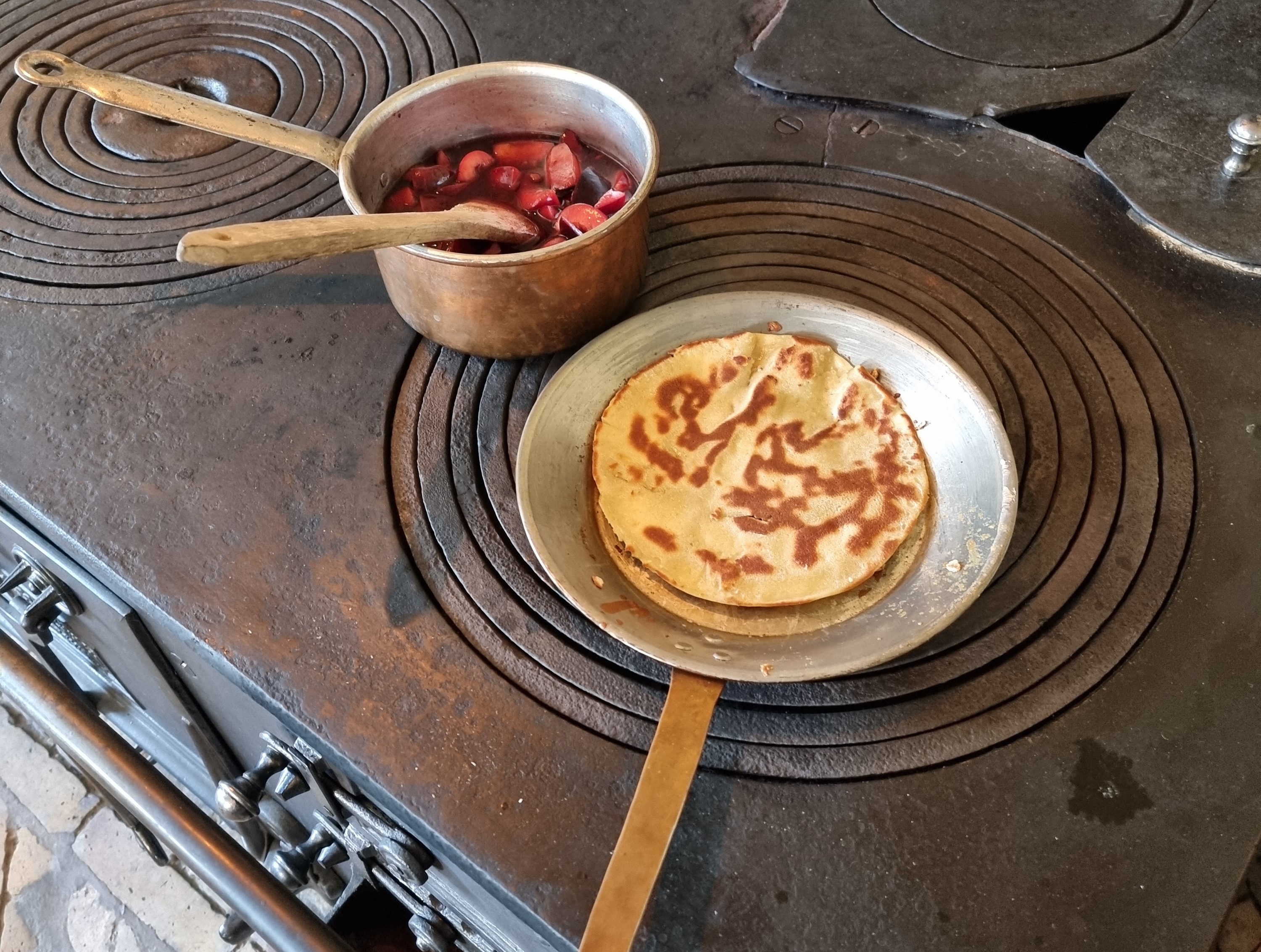 Da vi ankom, var der ved at blive tændt op og der blev tilberedt blomme-kompot, som skulle serveres til pandekager, som dog ikke var påbegyndt endnu. Men komfuret var flot og kokkepigen var tydeligvis glad for at fortælle historier om komfuret. Dejligt! Efter et visit i caféen (hvor de bl.a. har virkelig lækre små dessert-tærter), var den første pandekage på komfuret netop færdig og vi fik smagt et stykke. Naturligvis tilberedt efter en tidstypisk opskrift. Kompotten var ikke færdig endnu, hvilket datteren fandt interessant, da den jo var sat over før pandekagen. Og pandekagen? Den smagte rigtig godt! Jeg må se, om jeg kan finde kogebogen og prøve at lave den slags pandekager selv. Måske med blomme-kompot til?