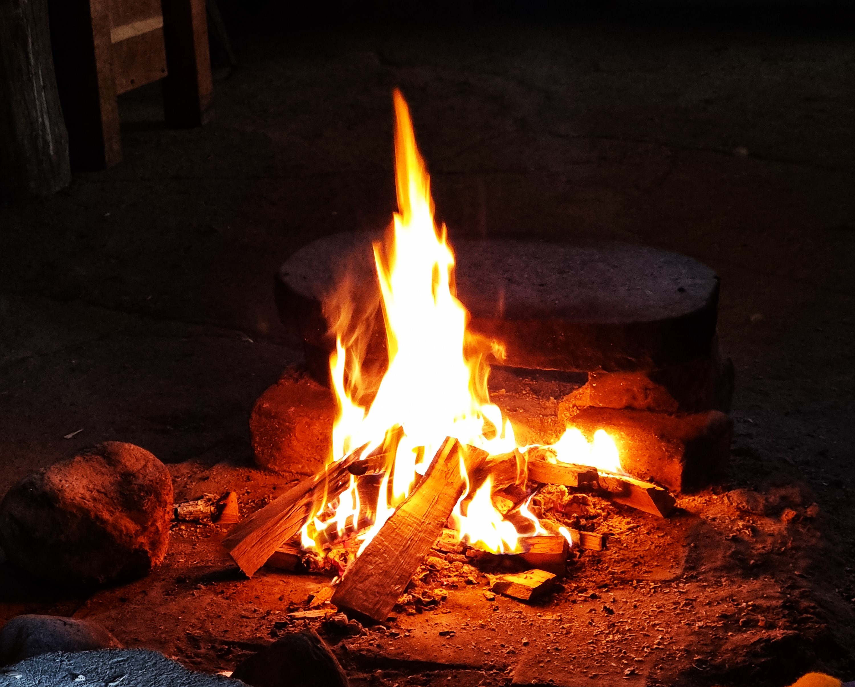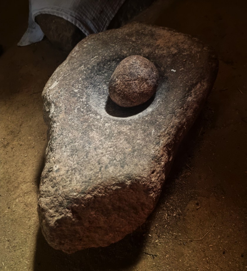 Et af husene var en rekonstruktion af et kendt hus, nemlig Overbygård. Huset brændte ned i jernalderen og flere faktorer gjorde, at det arkæologisk var velbevaret. Det er blandt ved hjælp af dette hus, at vi ved de for eksempel havde hylder på væggene i jernalderen. Dette rekonstruerede hus imponerede ved at have 3 kværnsten stående – sten til at grutte mel med. Dette var dog ikke det imponerende… det var det dog, at den ene sten faktisk var et arkæologisk fund, fundet i det originale jernalderhus, som nu var rekonstrueret. Kværnstenen havde de fået lov at få og den var naturligvis placeret dér, hvor man fandt den i det faktiske fund. Vores guide fortalte, at netop denne kværnsten var lidt dybere i udhulningen og man mener, at den måske har været til at knuse for eksempel urter i, fremfor korn. En form for forhistorisk morter. Men som den dag i dag stadig bruges til det samme, som den blev brugt til i oldtiden. Så kan man vist snakke om at komme tæt på sine forfædre, mens man laver mad. Meget spændende!