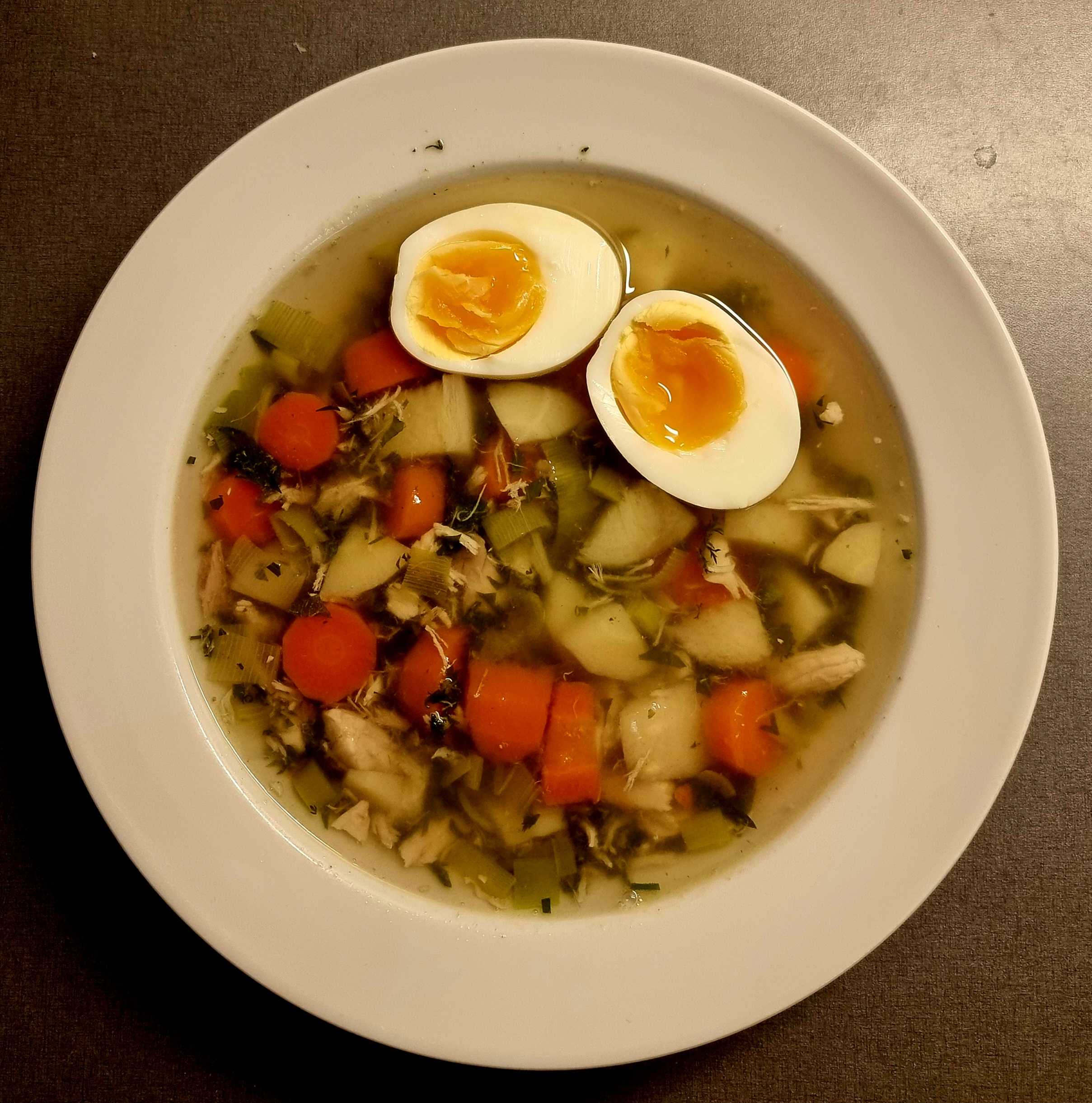 Min skærtorsdagssuppe på Skidenlørdag fik også tilsat porre, gulerod og pastinak, samt en lille håndfuld peberkorn og naturligvis salt. Og så har jeg været i haven og i naturen for at samle de 9 slags grønt, jeg gerne ville have i retten. Det blev til skvalderkål, brændenælde, lancet-vejbred, røllike, purløg, rosmarin, mynte, oregano samt mælkebøtte. Alt blev skyllet og finthakket og tilsat suppen. Da kyllingen var kogt godt mør, blev kødet pillet af og pillet i mindre stykker, mens suppen kogte ind sammen med det finthakkede grønt. Tilbage i suppen kom kyllingekød og suppen blev serveret med et smilende æg, som en slags hilsen til de Skidne Æg.