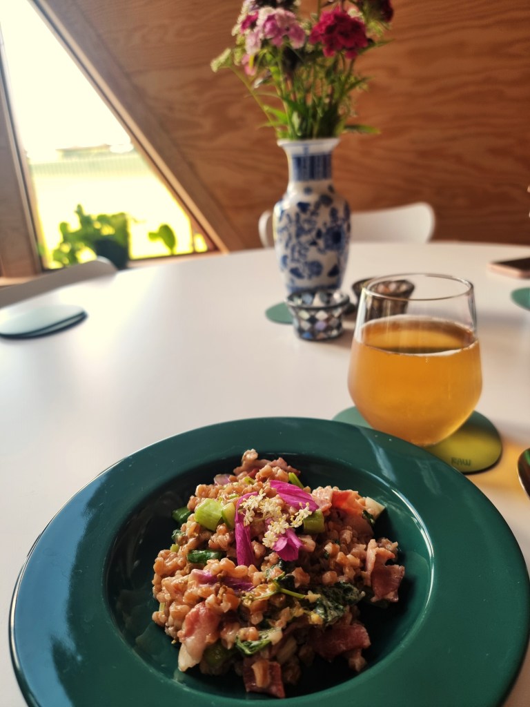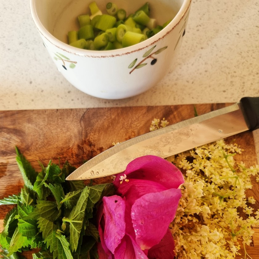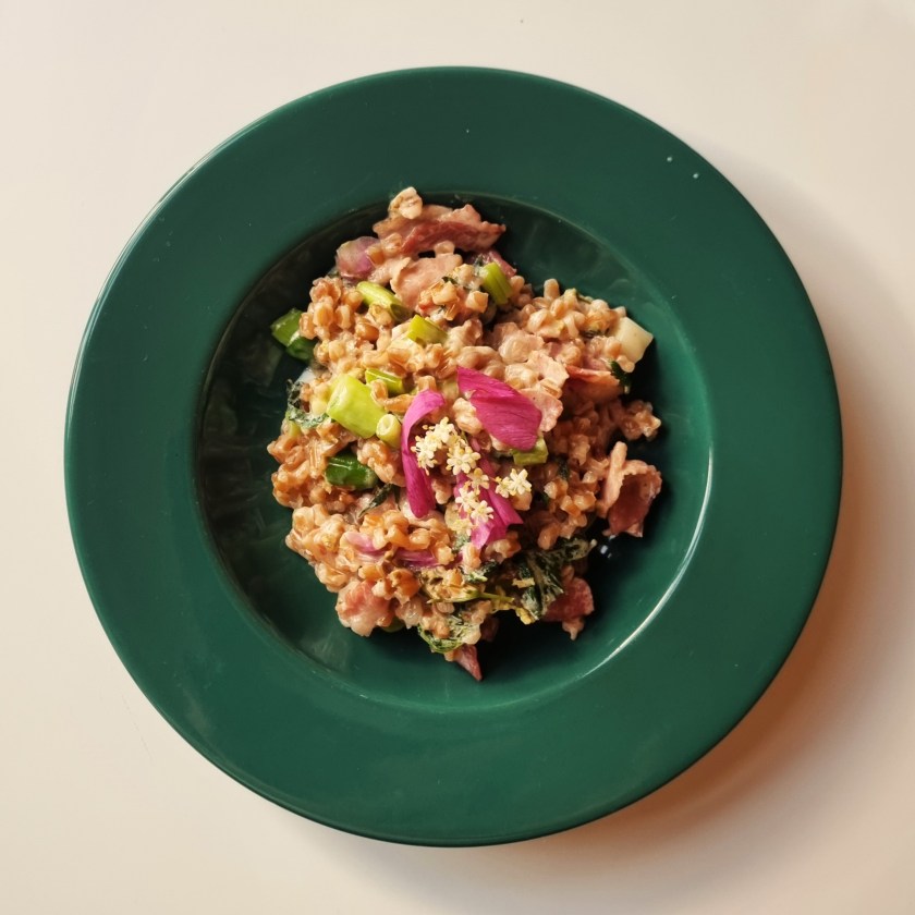 Urterne er dem, der lige er til at finde i nærheden af dér, hvor du laver din mad. Det kan være forskelligt alt efter, hvor man er, eller årstiden. De urter jeg fandt og brugte denne gang blev brændenælde, hyldeblomst og hybenrose. Før har jeg blandt andet også brugt løgkarse, vejbred og skvalderkål. De korn jeg brugte denne gang var perlespelt, som jeg havde kogt på forhånd, så de hurtigt blev tilberedt i retten. Før har jeg for eksempel brugt havregryn eller valset byg i denne ret. Velbekomme.