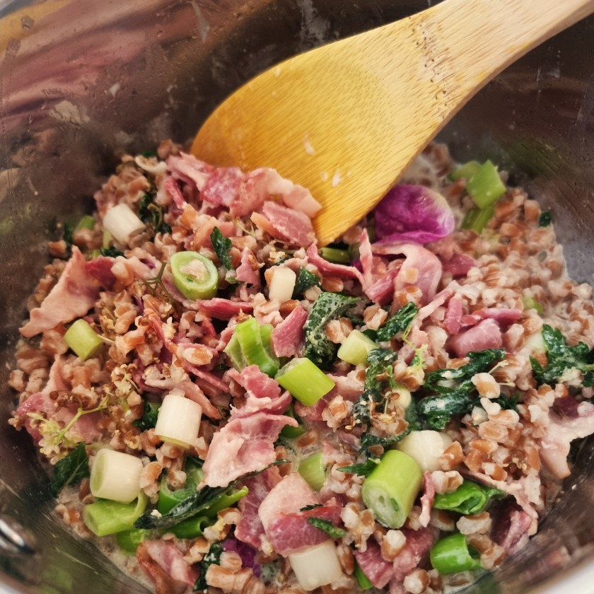 Bacon i mindre stykker (i tern eller klippede skiver) steges i gryden. Hakkede forårsløg tilsættes. Urterne skylles, hakkes og tilsættes, når løgene er blevet lidt bløde. Lad de hakkede urter blive lidt bløde. Nu tilsættes korn eller gryn samt fløde til det næsten dækker. Lad retten koge ind under omrøring til grynene er bløde og retten er blevet grød-agtig. Hvis det bliver for tykt, tilsættes lidt mere fløde. Det skal ikke koge tørt. Når retten har en god konsistens, serveres den. Ved bål gerne med snobrød eller fladbrød ved siden af. Man kan også servere lidt hjemmelavet tykmælksost eller creme fraiche til.