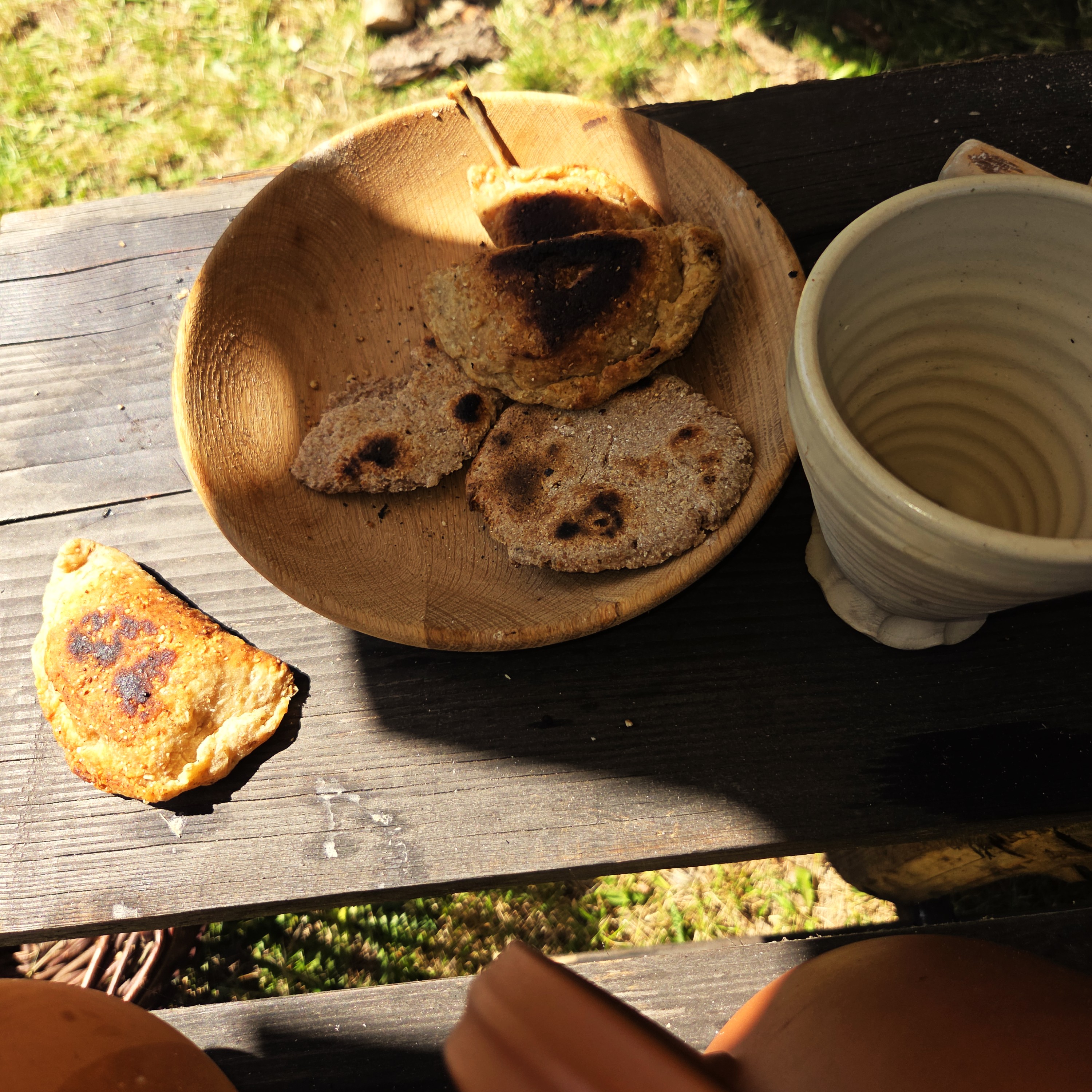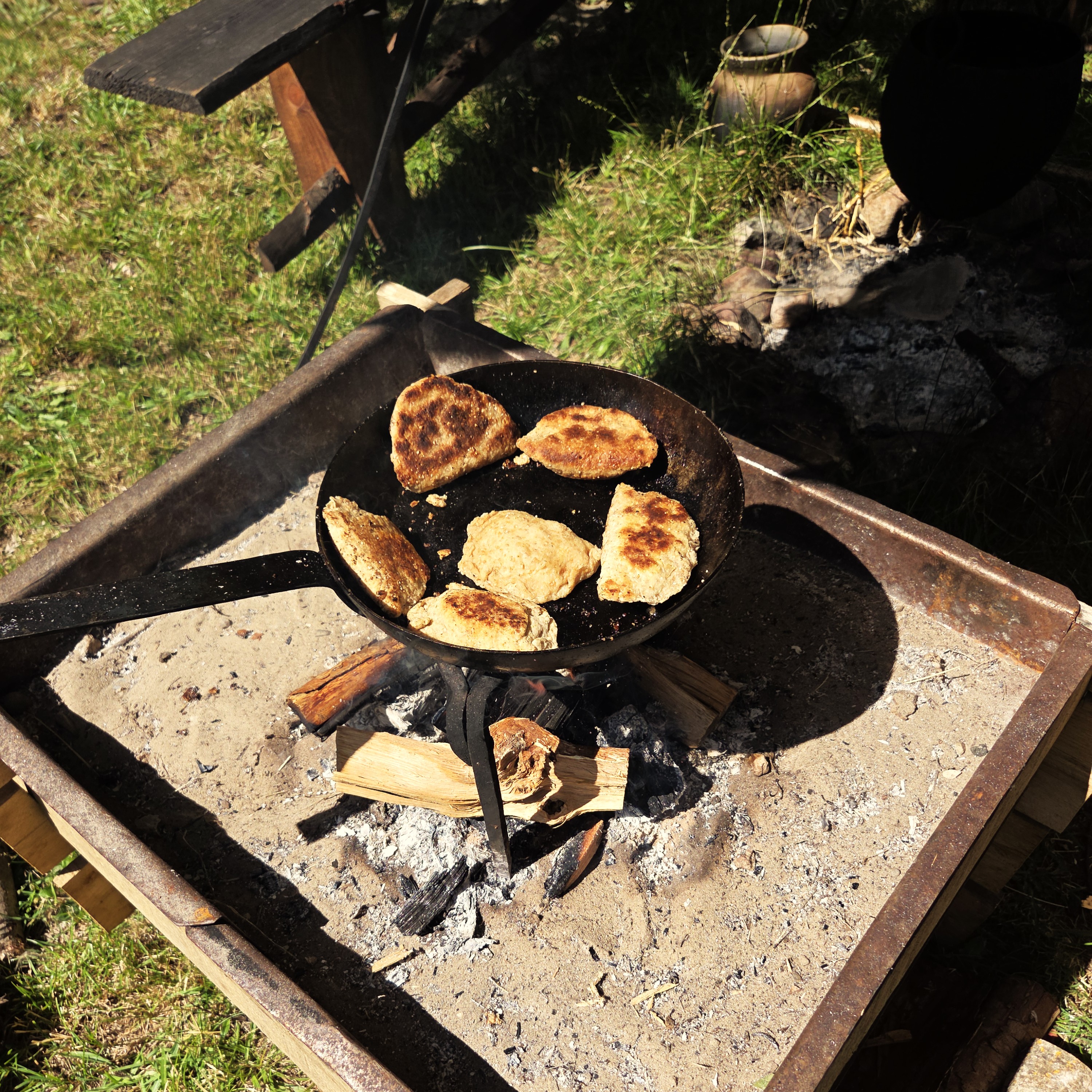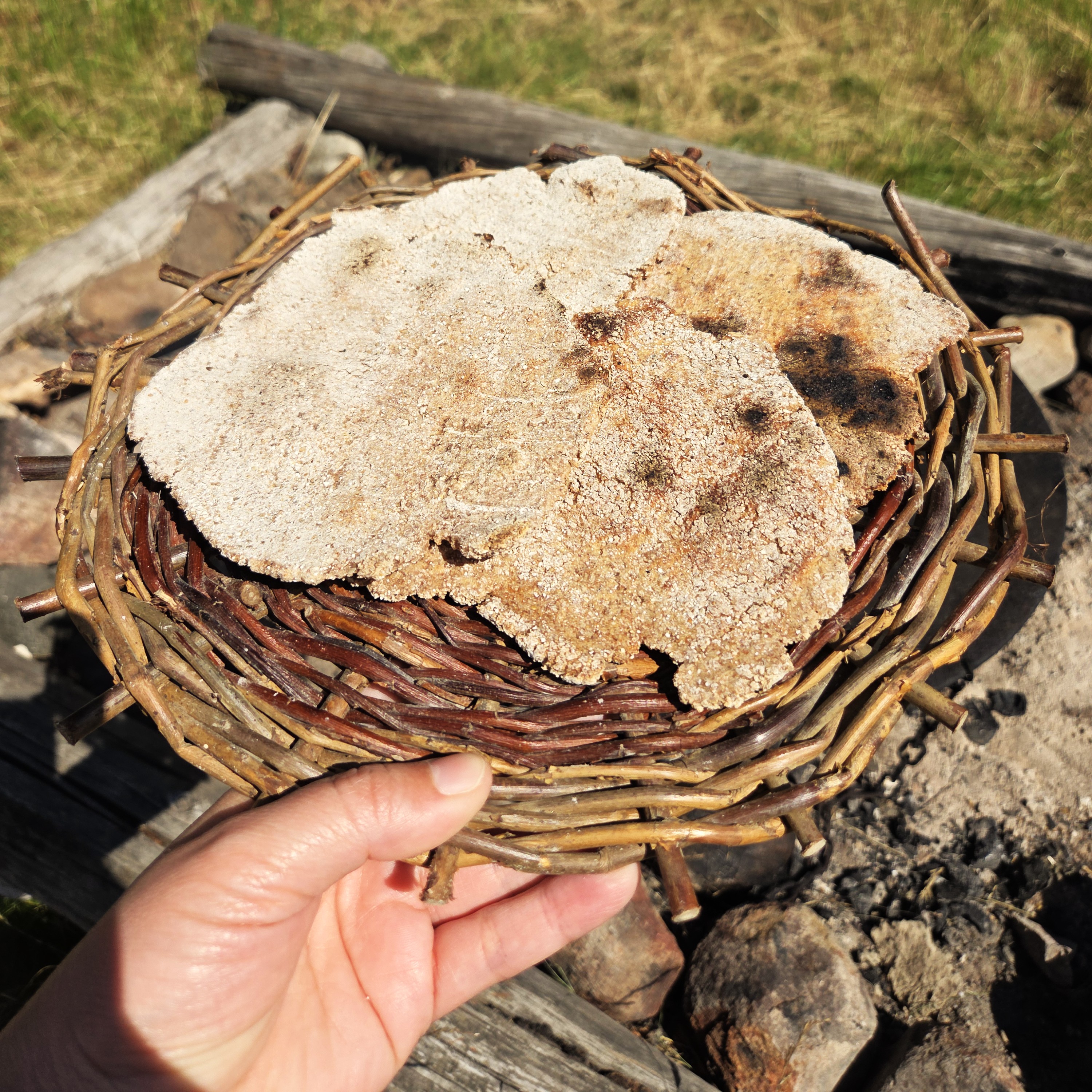 Vi gik stille rundt og kiggede for os selv, da vi blev spurgt om vi ville bage fladbrød – og efter et par øjeblikke genkendte jeg en tidligere kollega fra Sagnlandet Lejre. Herefter fik datteren og jeg bagt et par fladbrød ved bålet, hvor gamle vaner hurtigt indfandt sig, når brødene skal tjekkes og vendes.